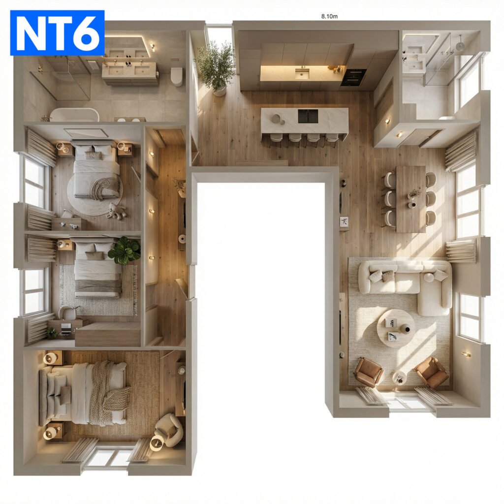 Patogus ir racionalus patalpų išplanavimas: trys miegamieji ir svetainė su virtuve